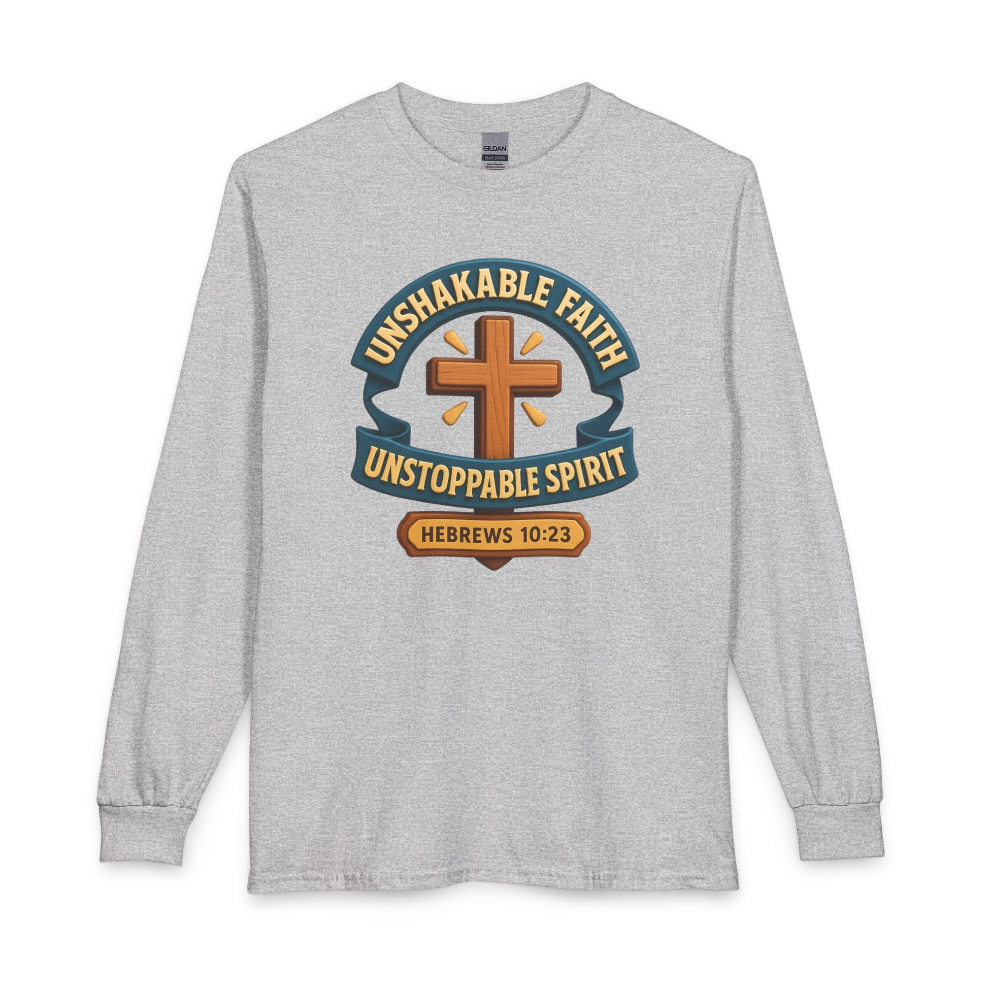 Step boldly into your day with this empowering long sleeve tee that declares your steadfast faith and unstoppable spirit. Crafted for comfort and inspiration, this shirt is perfect for cooler weather, layering, or making a statement at church, family gatherings, or casual outings.