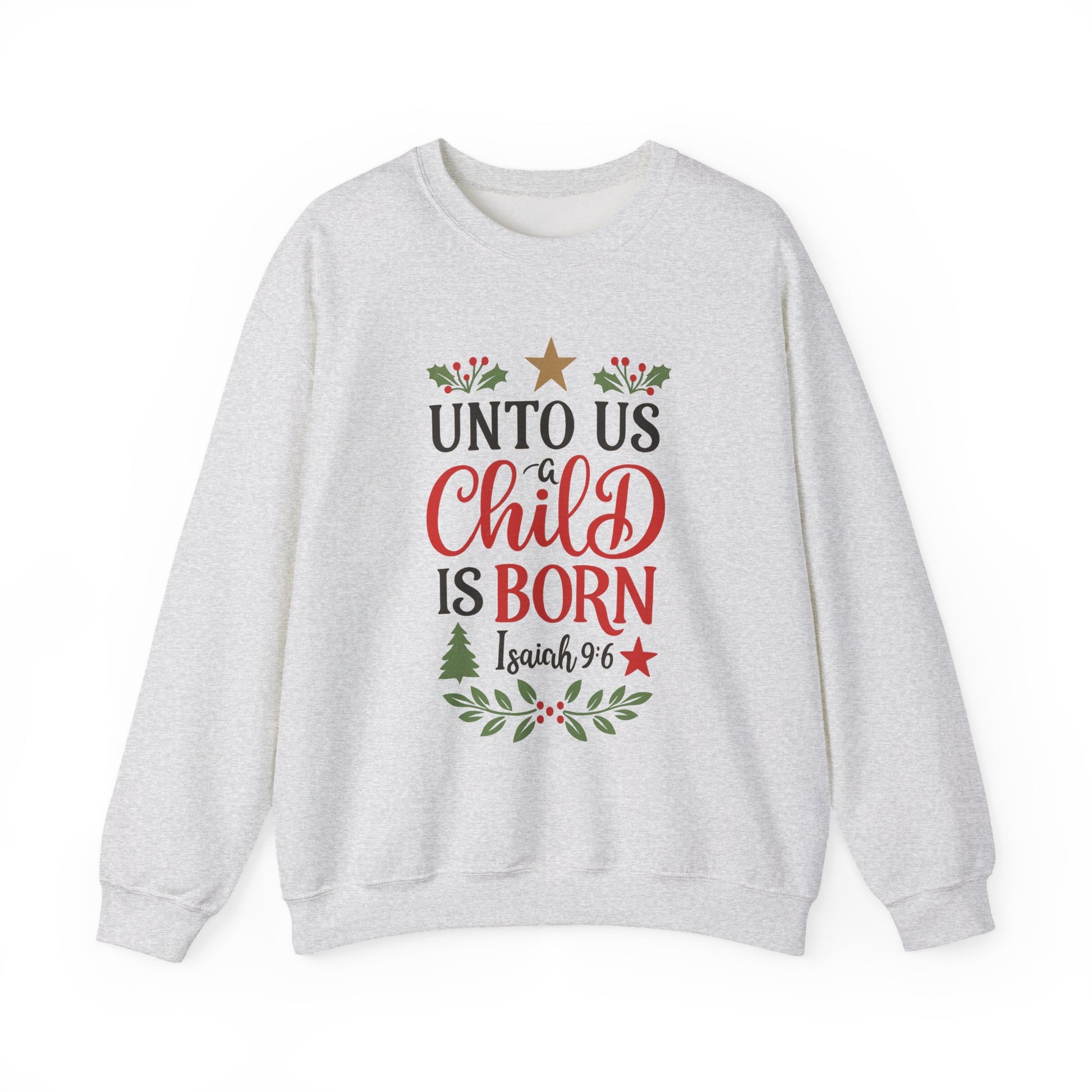 Celebrate the true meaning of Christmas with this cozy sweatshirt featuring the timeless message: "Unto Us A Child Is Born." Inspired by Isaiah 9:6, this design honors the birth of Christ with warmth, grace, and spiritual depth. Whether you're attending a holiday service, caroling with loved ones, or simply sipping cocoa by the fire, this sweatshirt wraps you in comfort and faith. Made from soft, durable fabric with a relaxed fit, it's a beautiful way to share your beliefs and spread holiday cheer.